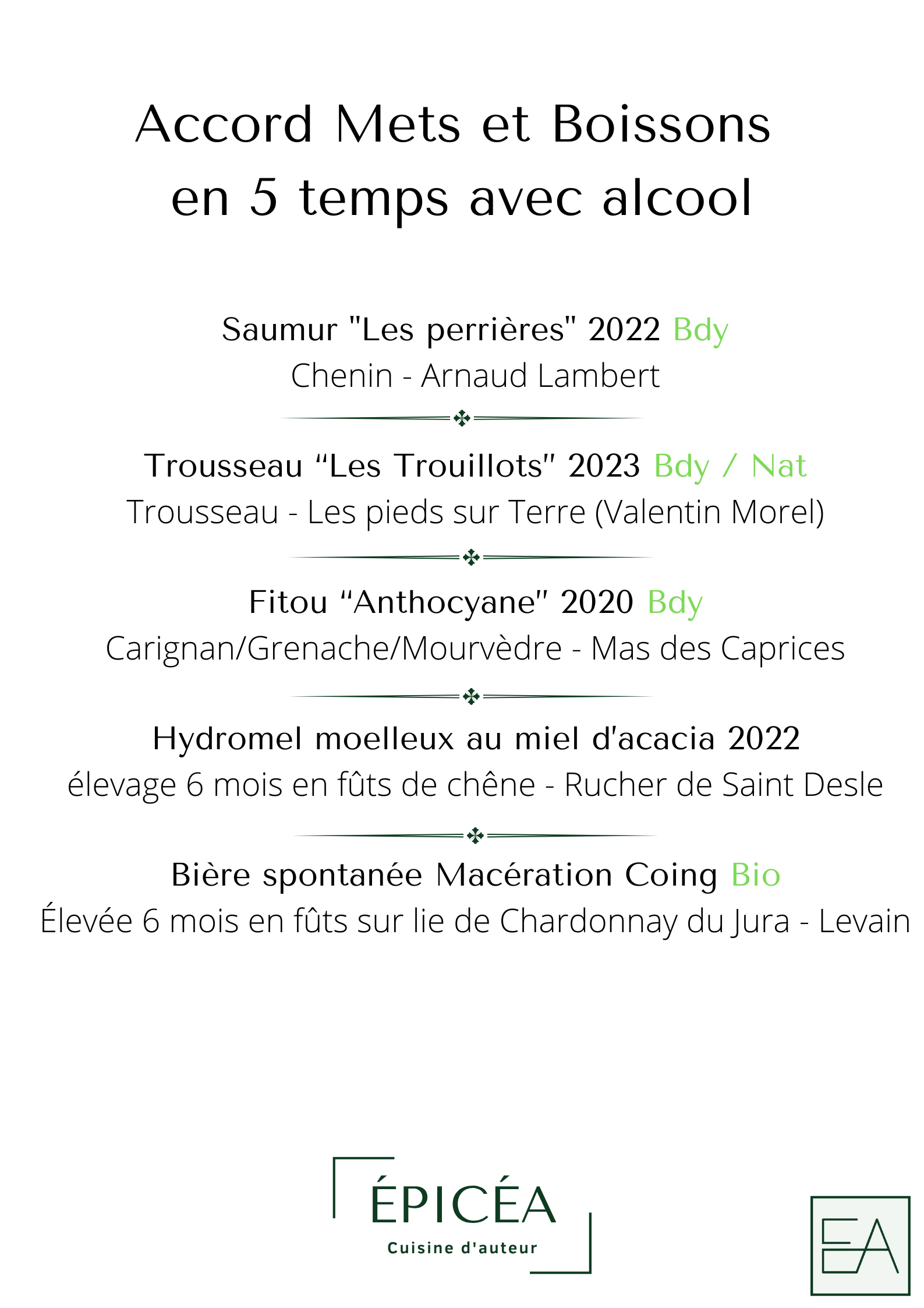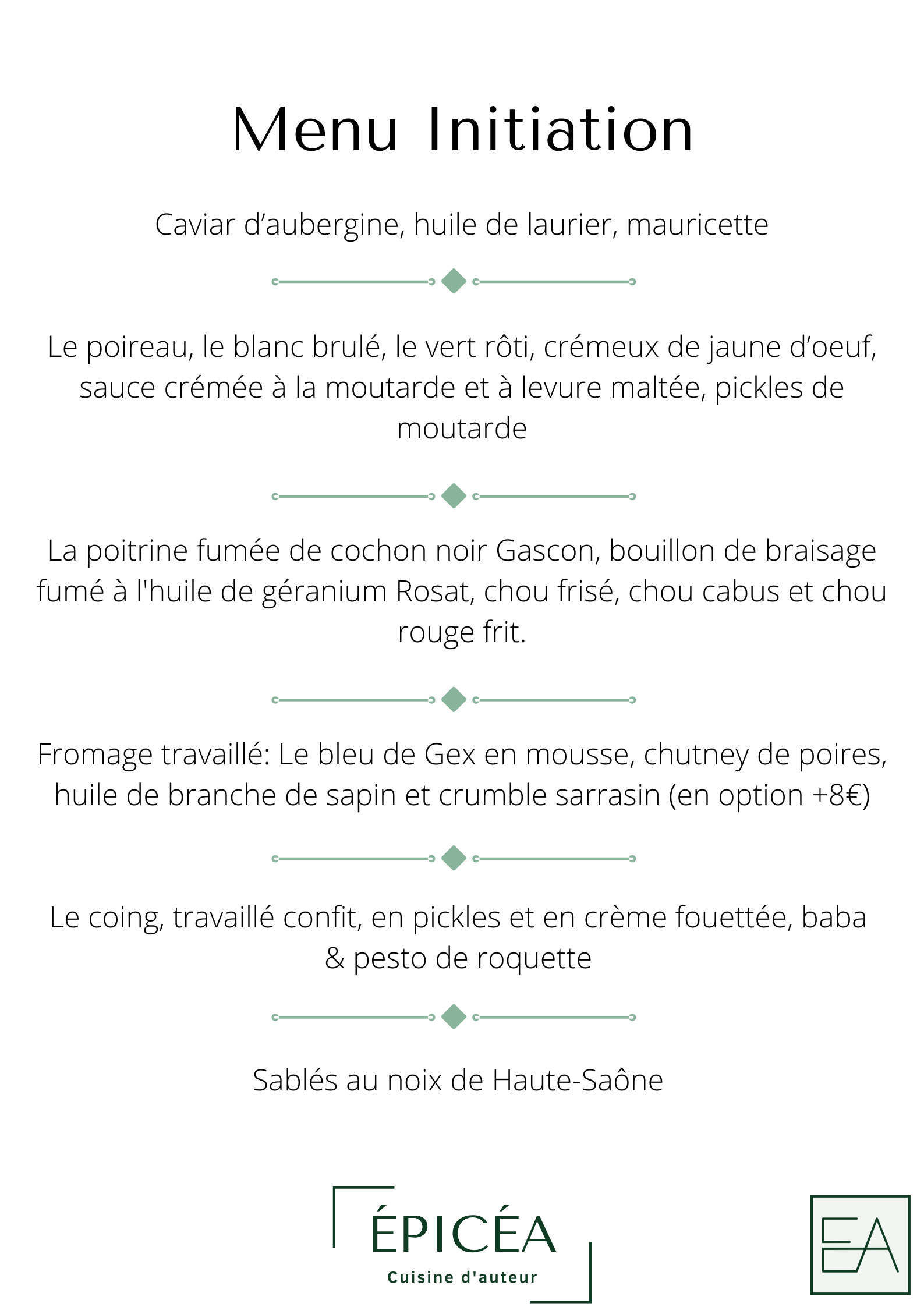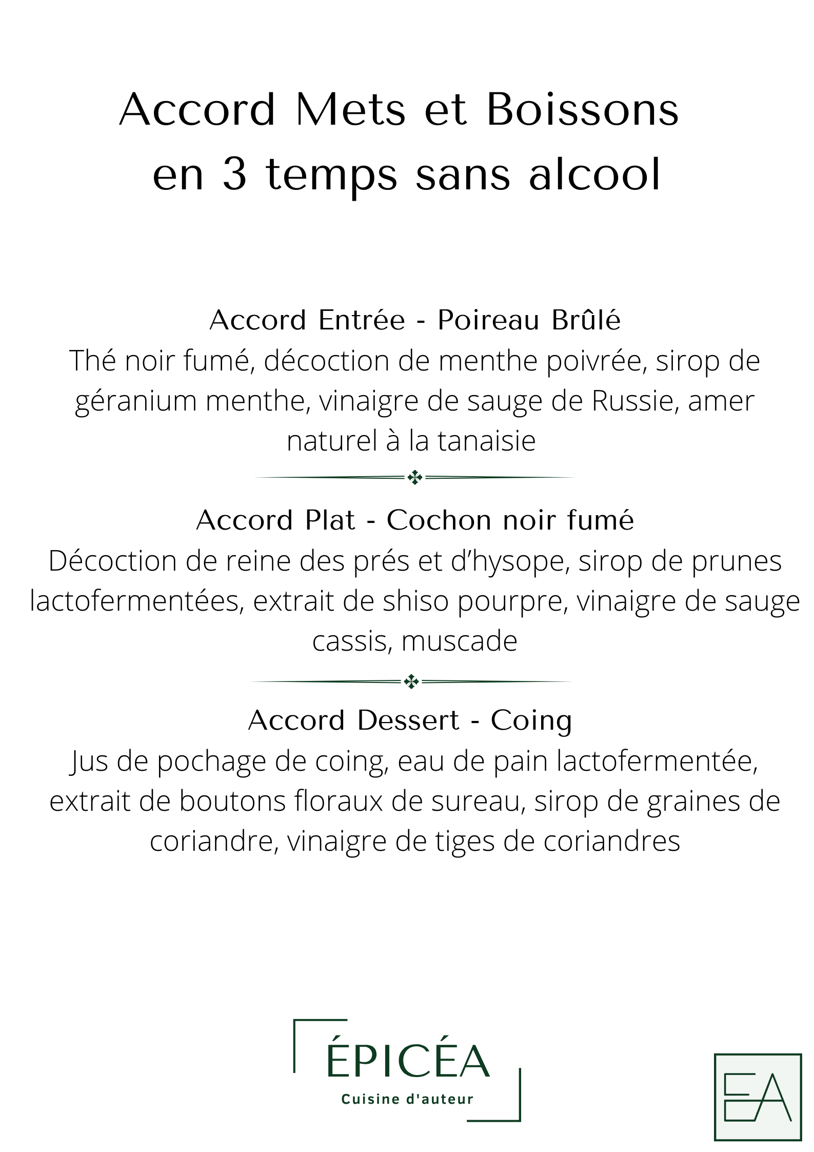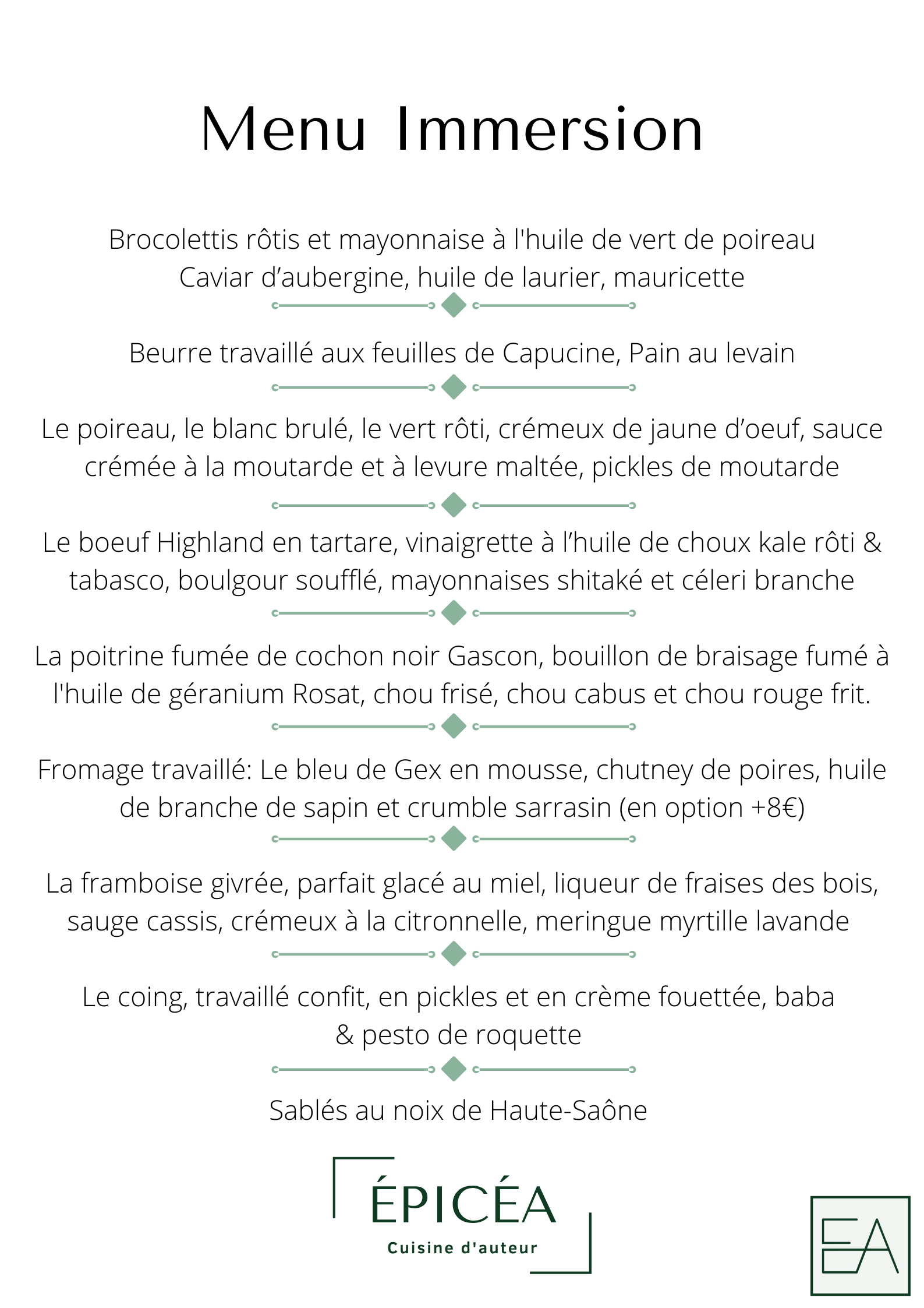 À Épicéa se révèle une cuisine d’auteur, avec une réflexion approfondie sur l’élaboration des plats. Une cuisine qui se construit autour d’une ligne directrice : surprendre par son audace, son intensité et rassurer par la gourmandise ainsi que l’envie de faire plaisir.